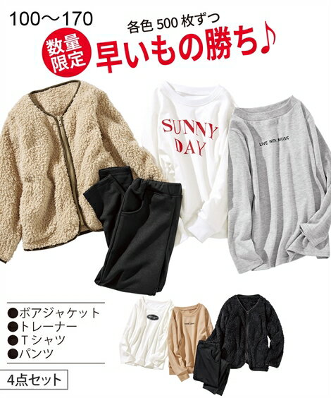 素材 品質=[Tシャツ]ポリエステル65%・綿35%(カットソー 天竺) [トレーナー]本体:ポリエステル65%・綿35% リブ:ポリエステル63%・綿32%・ポリウレタン5%(カットソー 裏毛) [パンツ]ポリエステル71%・綿29%(カットソー ポンチ)ポケット:前2 ウエスト総ゴム(ゴム衣取替口有) [ジャケット]本体:ポリエステル100%(ボア) 縁どり:ナイロン85%・ポリウレタン15% 前ファスナー開き ポケット:前2 柄の出方が多少異なる場合があります 原産国 中国製 メーカー品番 ZZY4321E1963 コメント 暑さがやわらぐ季節には長袖Tシャツを少し肌寒さを感じる季節にはトレーナー、寒くなってきたらボアジャケットとなんでも合わせやすいボトムの3シーズン着用OKでHAPPYな4点セットです さらにコスパもいいので限定数があるので早い者勝ち!