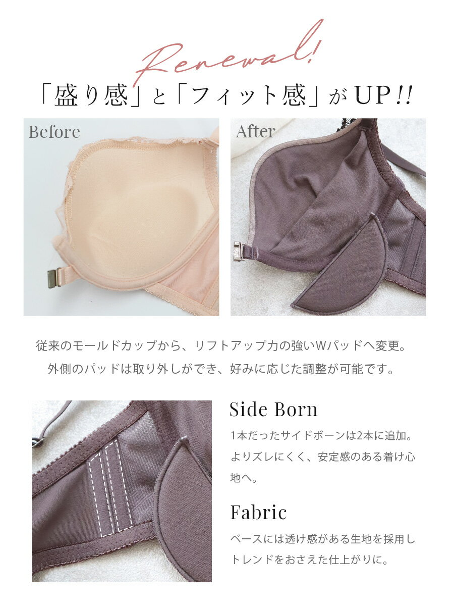 バージスラインに沿ったハーフムーンパッドがサイドからセンターへ しっかりとバストを引き寄せ、くっきり谷間へ導きます。